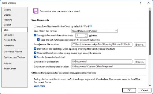Once all this is done, open the Word, and go to Word Options, Save tab. (see Figure 3 below) for suggested settings.